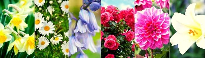 Narcisi, margherite, campanule, rose, dalie e gigli